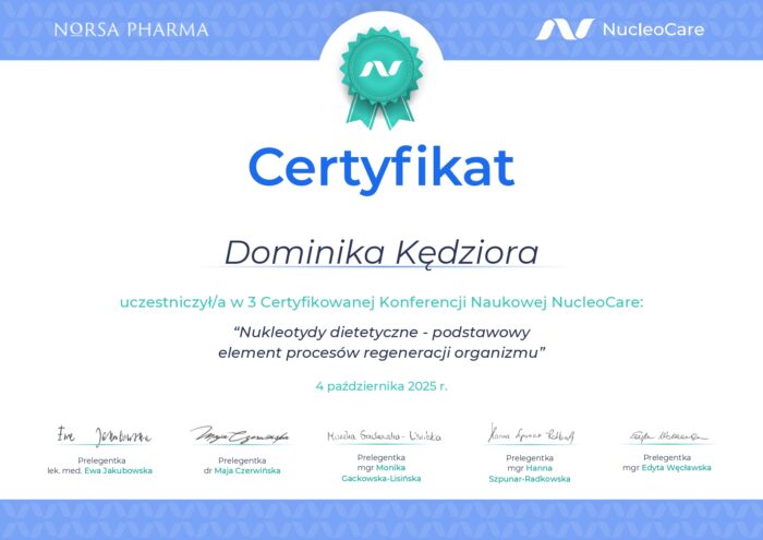 certyfikat rola nukleotydów dietetycznych w postępowaniu żywieniowym NorsaPharm Dominika Kedziora