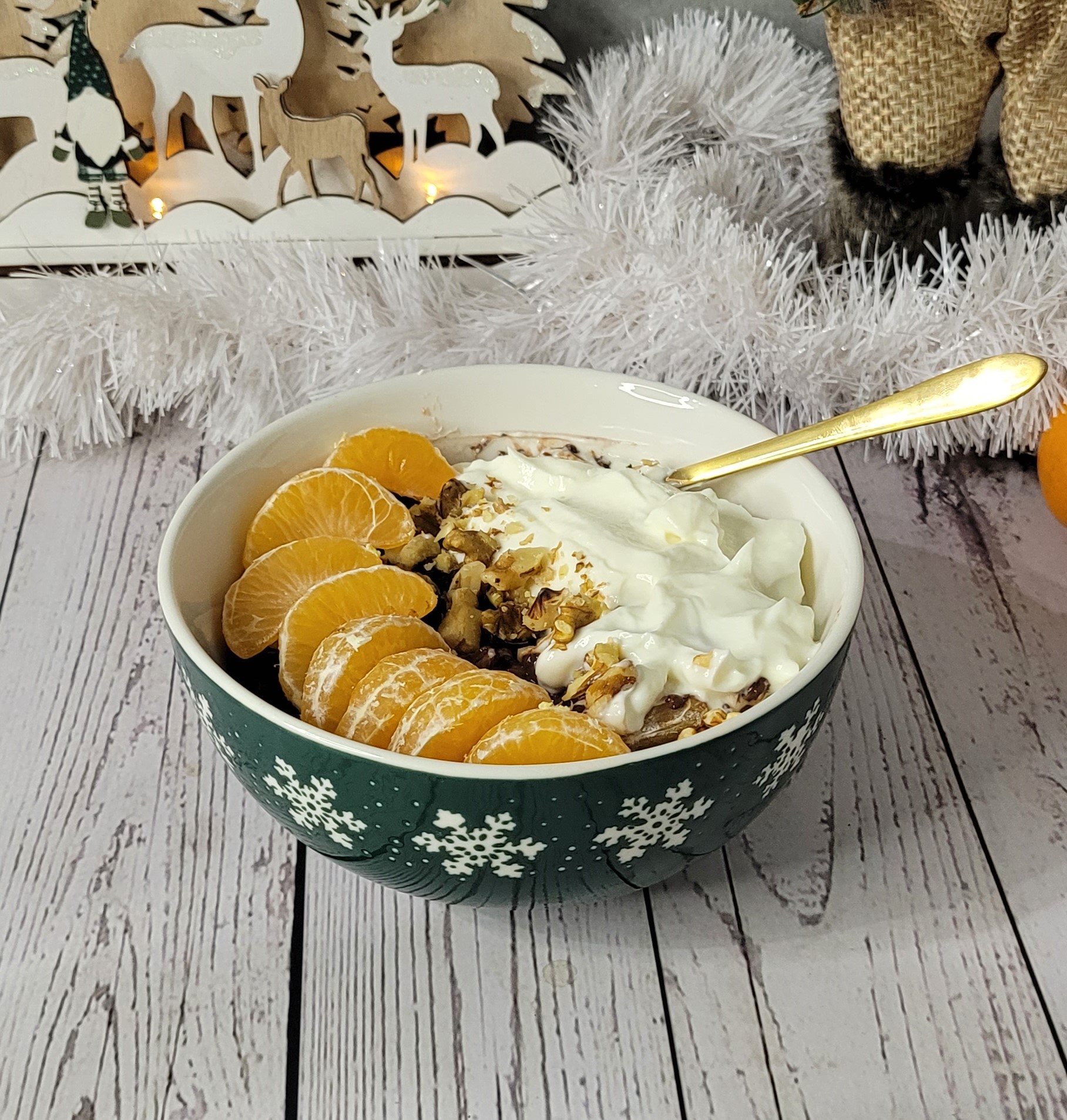Na górę ułóż skyr, posiekane orzechy i mandarynkę.